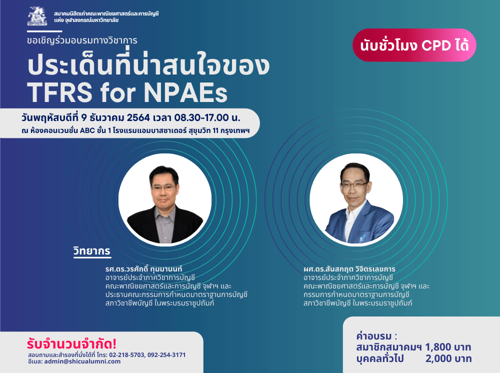 ขอเชิญร่วมอบรมทางวิชาการ หัวข้อ “ประเด็นที่น่าสนใจของ TFRS for NPAEs”