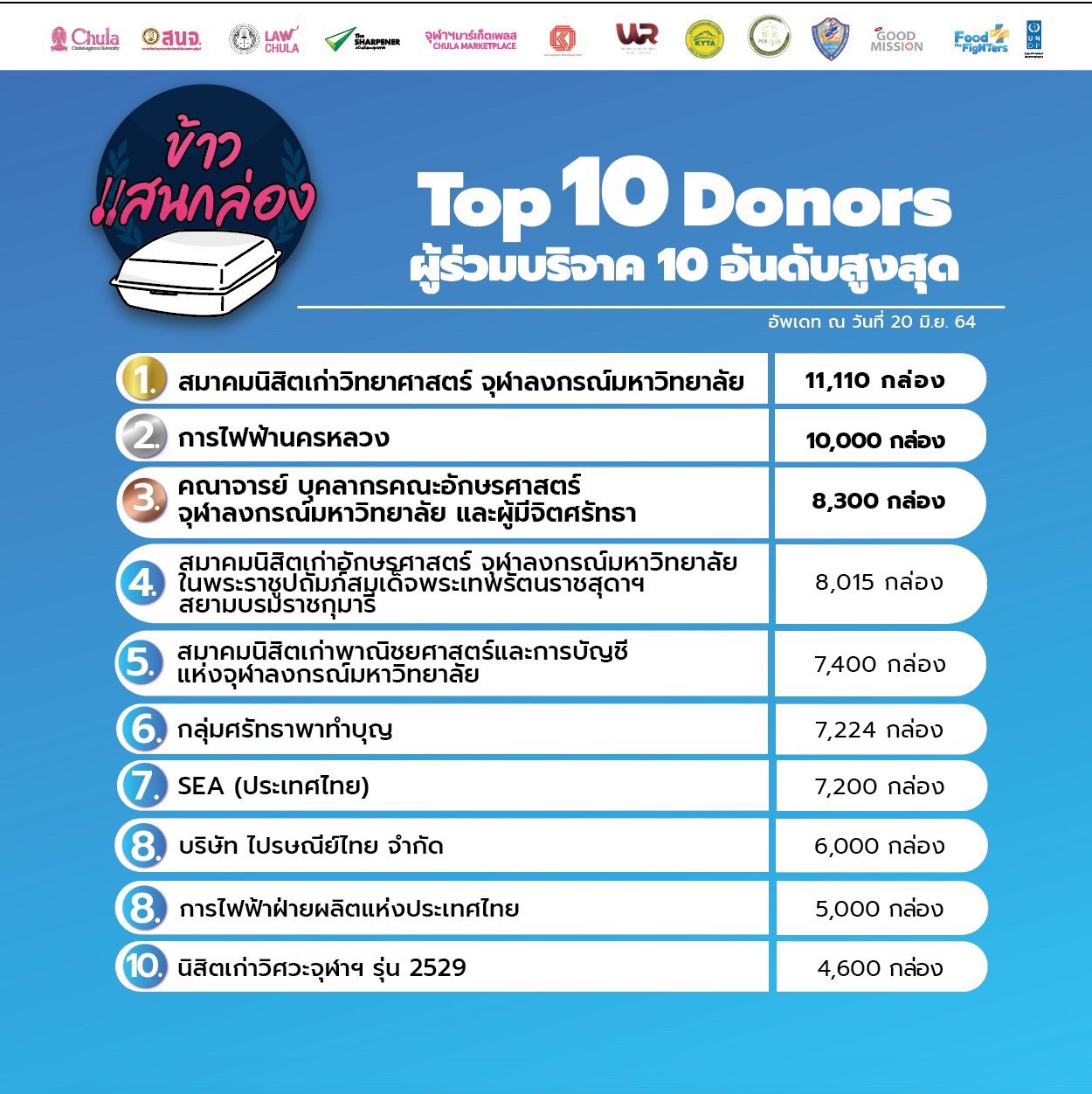 คุณวศิน วัฒนวรกิจกุล นายกสมาคมนิสิตเก่าพาณิชยศาสตร์และการบัญชี แห่ง จุฬาลงกรณ์มหาวิทยาลัย ยิงกระสุนนัดเดียวได้นก 2 ตัว ระดมเงินบริจาคจากคณะกรรมการสมาคมฯ และนิสิตเก่า มาอุดหนุนข้าวกล่องจากร้านอาหารของคณะฯ ซึ่งกำลังประสบวิกฤต COVID-19 เพื่อสนับสนุนโครงการ “ข้าวแสนกล่อง” ของสมาคมนิสิตเก่าจุฬาลงกรณ์มหาวิทยาลัย ในการช่วยเหลือประชาชนในชุมชนแออัดทั่วกรุงเทพฯ โดยส่งมอบข้าวกล่องตั้งแต่วันที่ 31 พฤษภาคม จนถึงวันที่ 19 มิถุนายน 2564 เป็นเวลา 24 วัน เป็นเงินทั้งสิ้น 320,000 บาท สามารถบริจาคข้าวกล่องได้รวมทั้งสิ้น 7,400 กล่อง นับเป็นผู้บริจาคมากที่สุดเป็นอันดับที่ 5